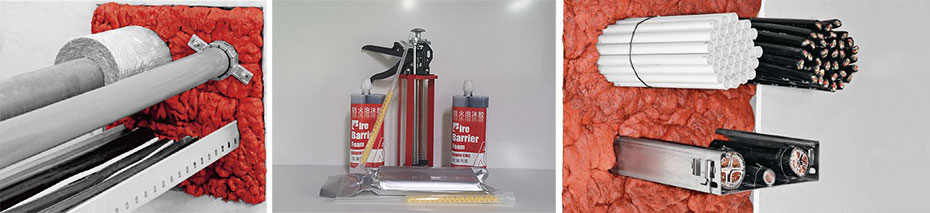 安翼陶基防火泡沫胶A/B料的混合比例为2:1,用胶枪施工时,体积膨胀扩大5~7倍,固化干燥后具有柔韧性,方便切割塑型,二次施工。遇火后可再次膨胀2倍左右,耐火性能>3小时。此类产品适用于电缆竖井、电柜缝隙等需要精准填充的场景,膨胀后形成致密层,有效阻隔火源和烟气。其防火机理是:通过受热膨胀填塞因电缆燃烧或本身烧蚀留下的空隙,形成高强度的炭化隔热层,从而有效阻隔火焰和热量向后传播。